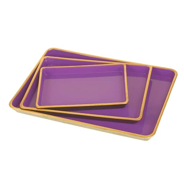 Das dreiteilige Werner-Voss Tablett-Set beeindruckt durch seine attraktive lila-goldene Farbgestaltung und das hochwertige Kunststoffmaterial.